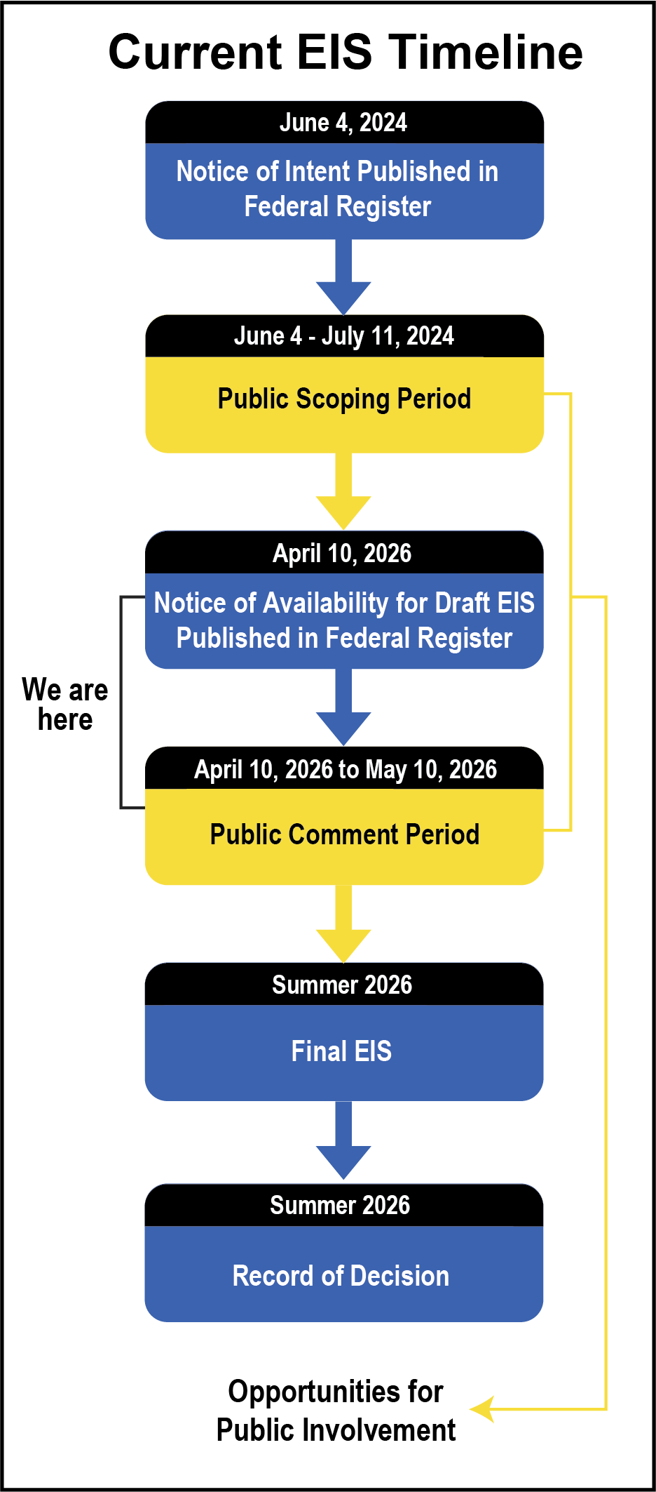 - Draft EIS Public Review and Comment Period (WE ARE HERE): Following scoping, the next opportunity for public comment is during the Draft EIS public review and comment period, which begins with publication of the Notice of Availability in the Federal Register. During this comment period, the public may review and comment on the environmental impact analysis presented in the Draft EIS. Input received during this comment period is considered in development of the Final EIS.
