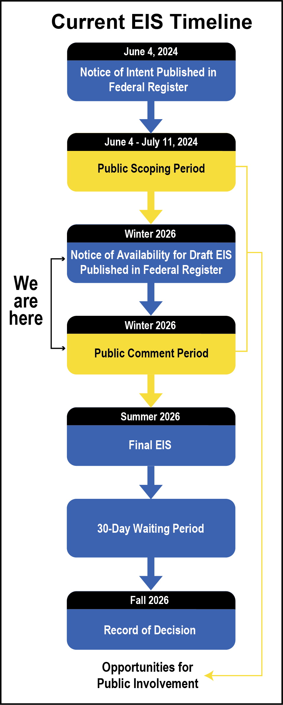 - Draft EIS Public Review and Comment Period (Upcoming Phase): After public scoping is complete, the next opportunity for public comment is during the Draft EIS public review and comment period. The Draft EIS public review and comment period is anticipated to begin in winter 2026 with publication of the “Notice of Availability” in the Federal Register. During the Draft EIS public review and comment period, the public will have the opportunity to review, evaluate, and comment on the environmental impact analysis presented in the Draft EIS. Input received during this comment period is considered in the development of the Final EIS.